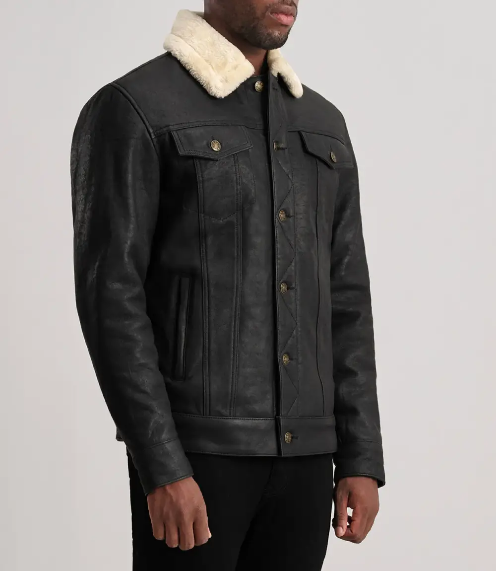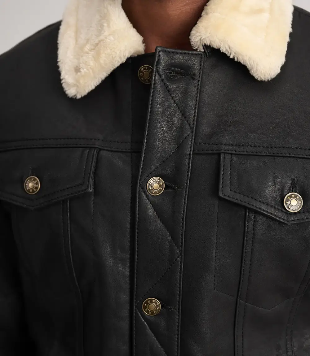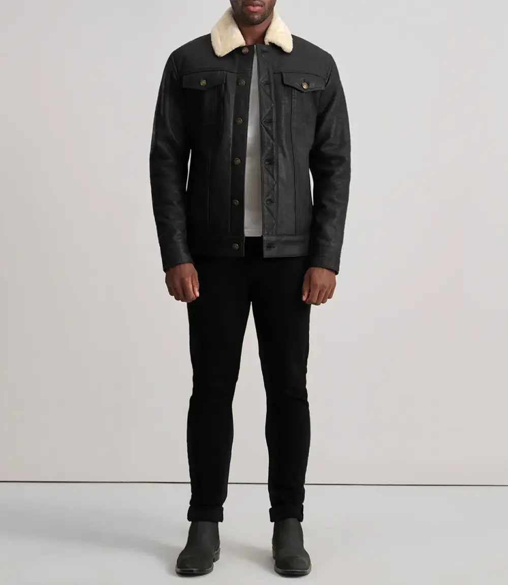 14 reviews for Men’s Dallis Distressed Black Leather Shearling Trucker Jacket