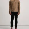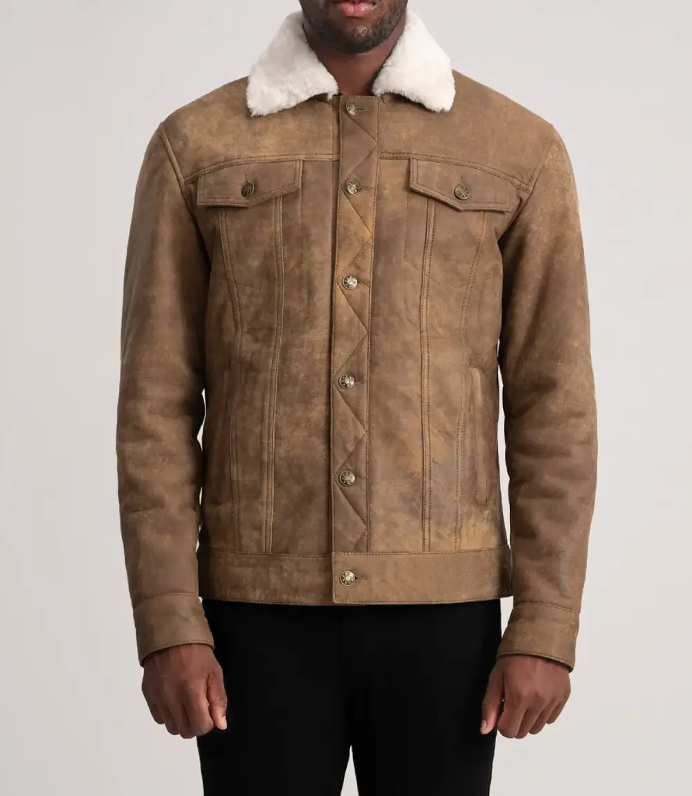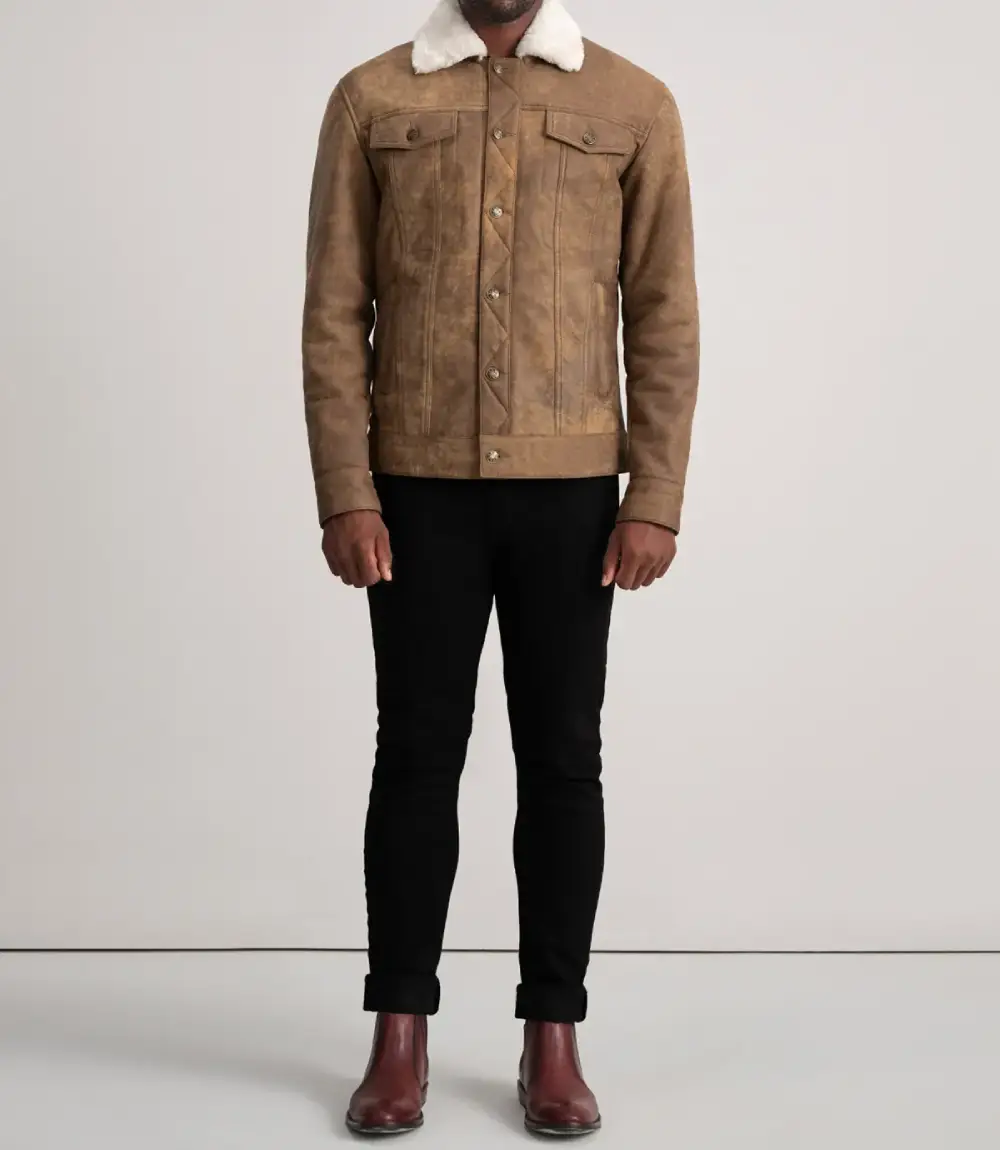 Rugged, stylish, and versatile, the Distressed Brown Dallis Shearling Trucker Jacket is the perfect layering piece for casual outings or relaxed evenings.