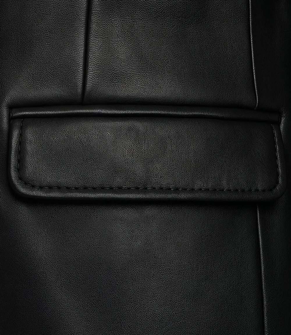 Practicality meets style with two waist flap pockets and a chest pocket, making it easy to keep your essentials close without compromising the streamlined design. Whether you’re attending an evening event, a business meeting, or dressing up a casual outfit, this black leather blazer is a versatile wardrobe staple built to last.