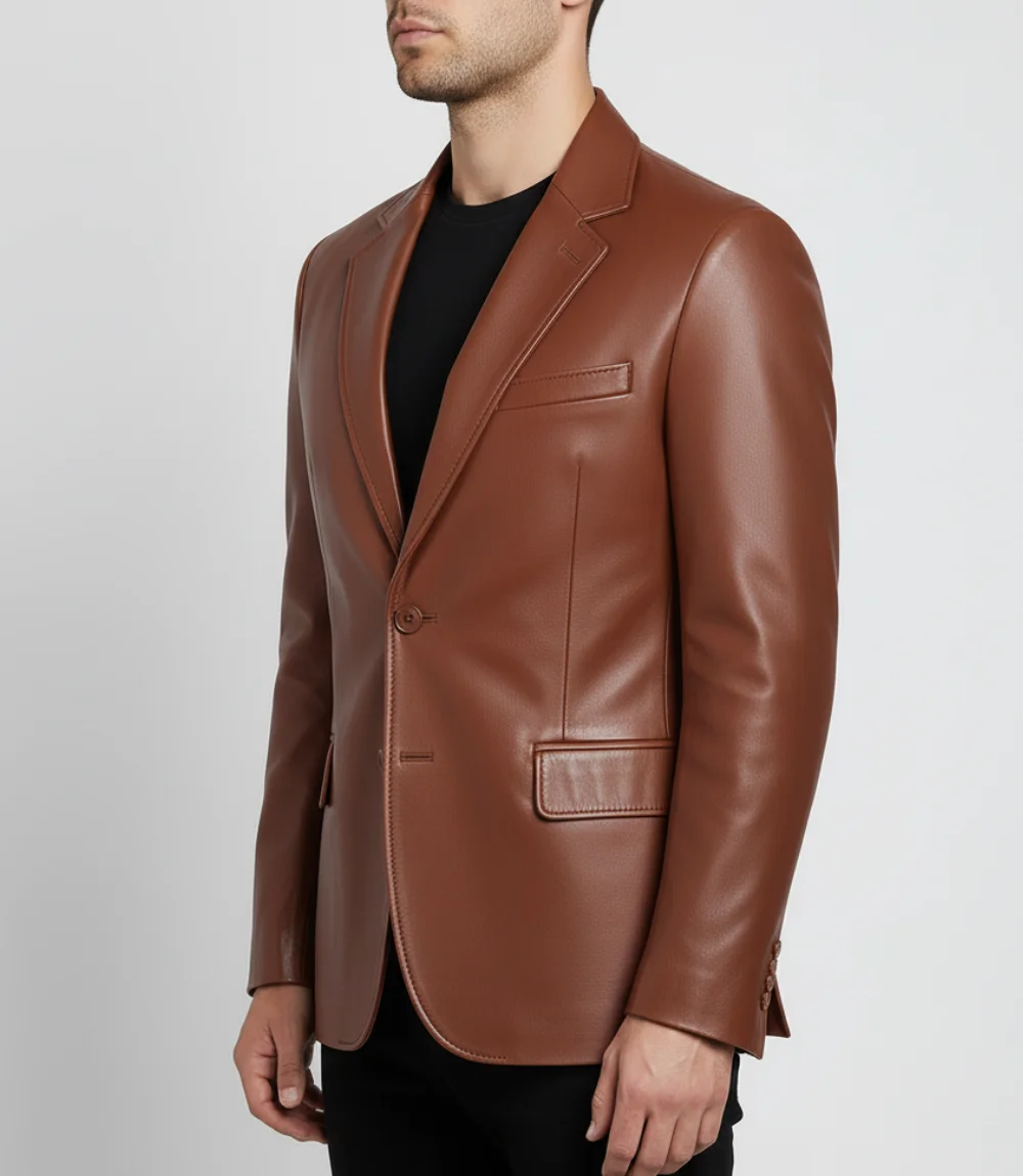 The Men’s Two Button Cognac Brown Lambskin Leather Blazer is a timeless essential that brings refined elegance to your wardrobe. Made from premium lambskin leather, it features a buttery-smooth texture and a rich cognac brown tone that adds warmth and sophistication to any outfit. Its sleek tailoring ensures a perfect balance between modern minimalism and classic style, making it suitable for business, semi-formal events, and elevated casual looks.