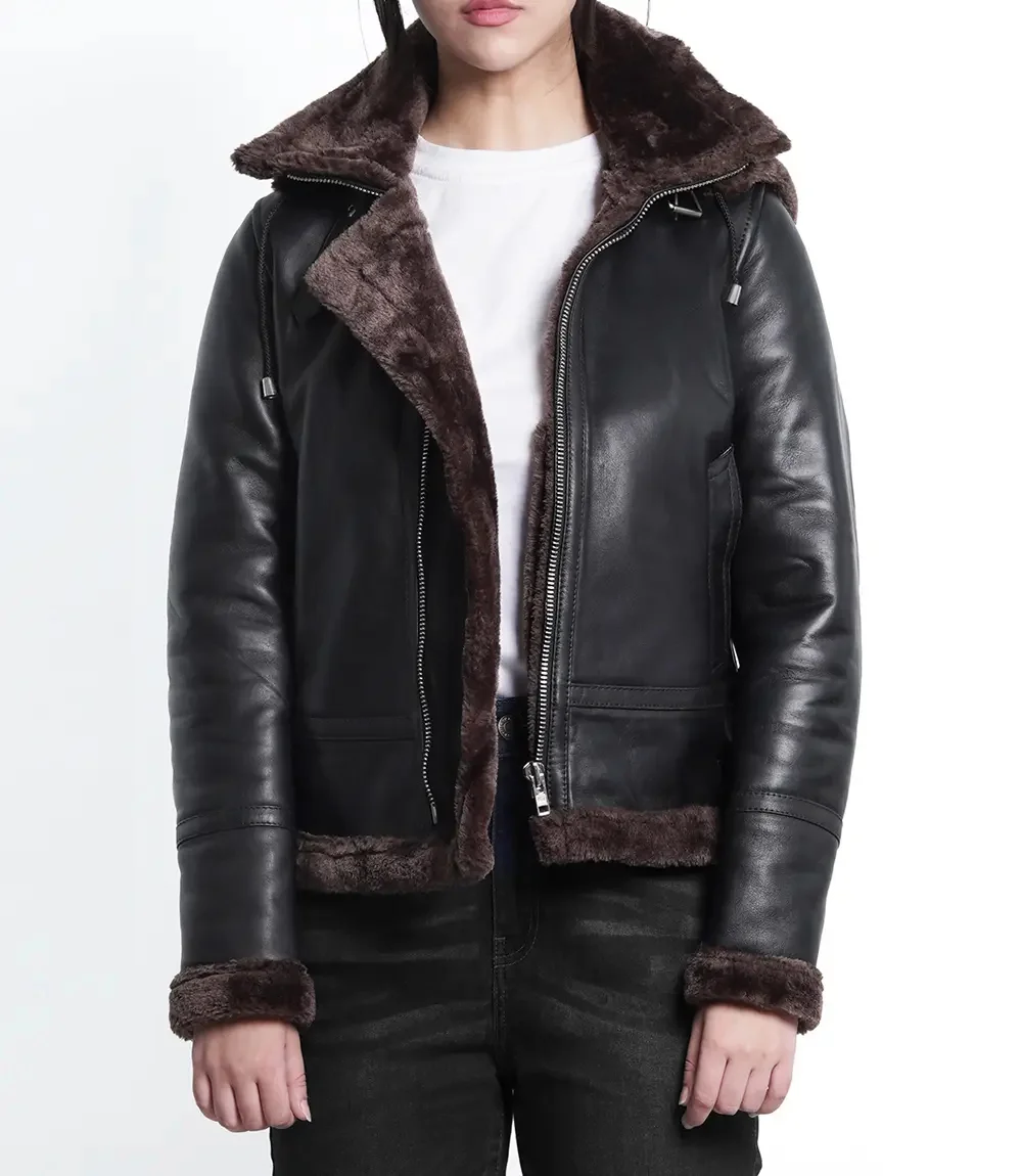 Women’s Dark Brown Bomber Shearling Leather Jacket With Hood