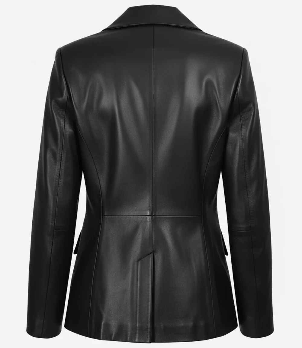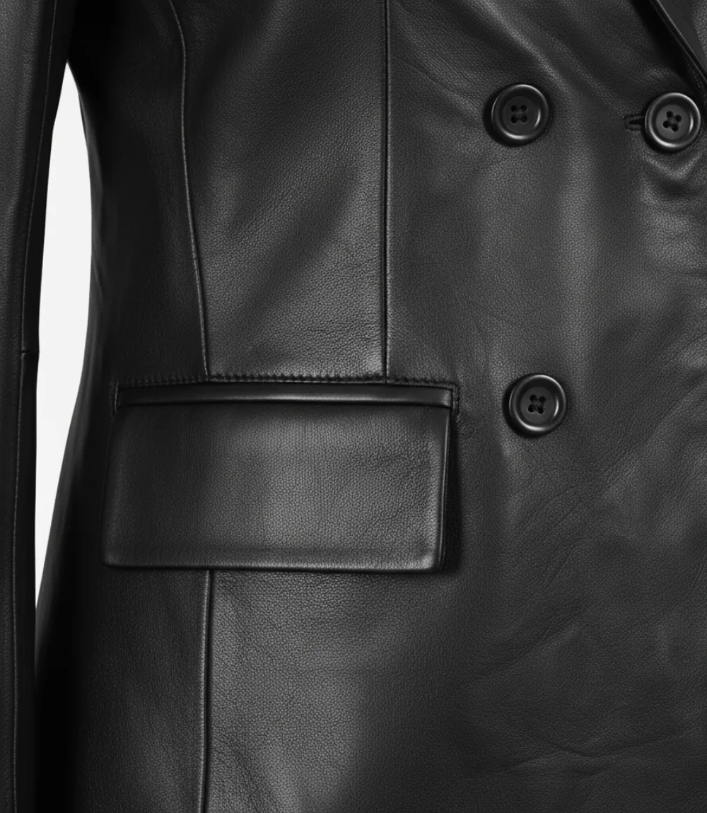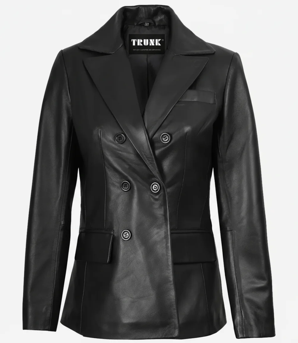 The Women’s Black Notch Lapel Collar Double Breasted Leather Blazer blends timeless elegance with modern sophistication. Made from 100% lambskin leather and lined with soft polyester, it features a structured double-breasted front and classic notch lapel collar for a refined silhouette. With three outer pockets and one inside pocket, it’s both stylish and practical — perfect for winter wear, parties, or as a luxurious gift.