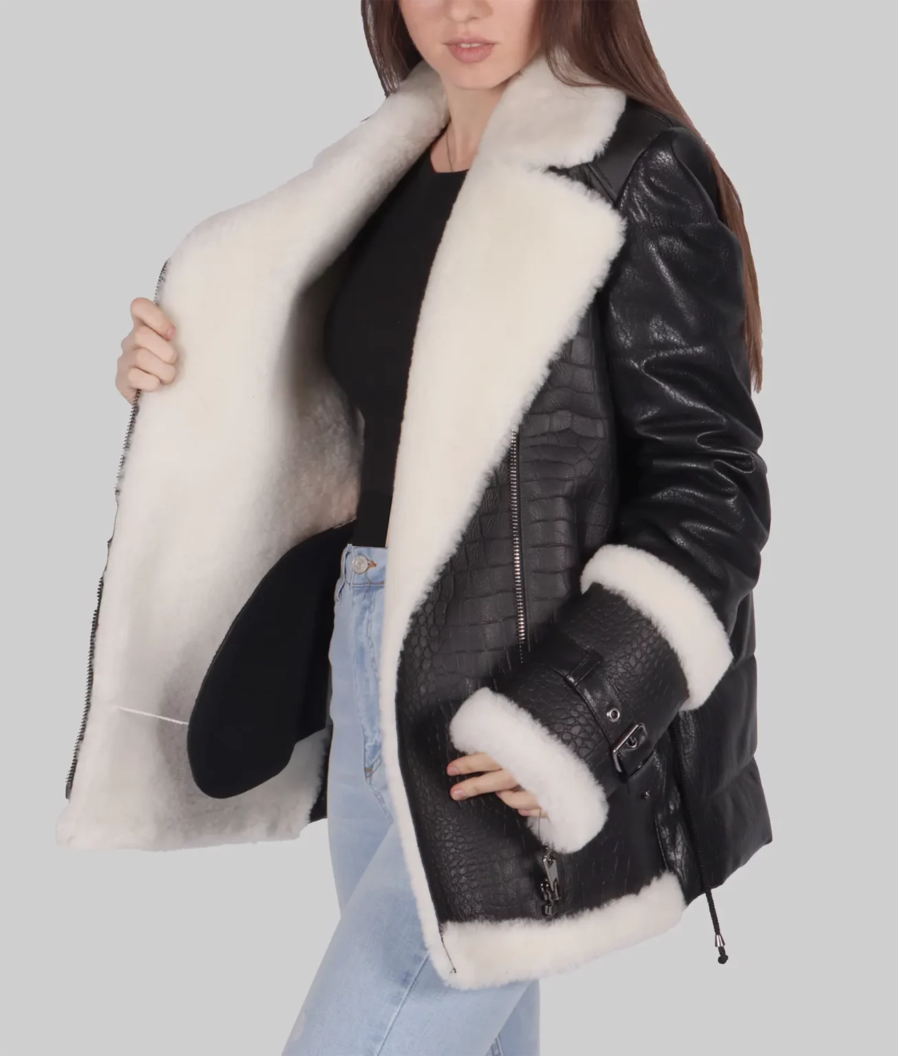 Featuring a lapel-style shearling collar and shearling-trimmed cuffs, this jacket embodies classic bomber aesthetics with a luxurious twist. The front zipper closure adds a sleek finish, while two exterior and one interior pocket provide both style and practicality.