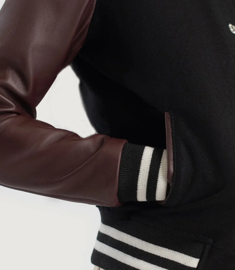 Stand out in style with the Women’s Savant Maroon & Black Hybrid Varsity Jacket. Crafted with sheepskin leather sleeves featuring a semi-aniline finish and a synthetic wool torso, it blends premium materials with modern varsity flair.