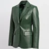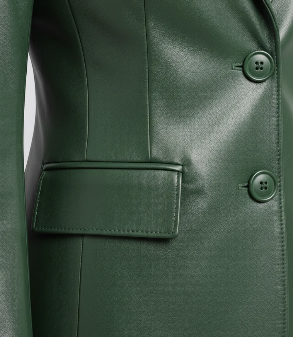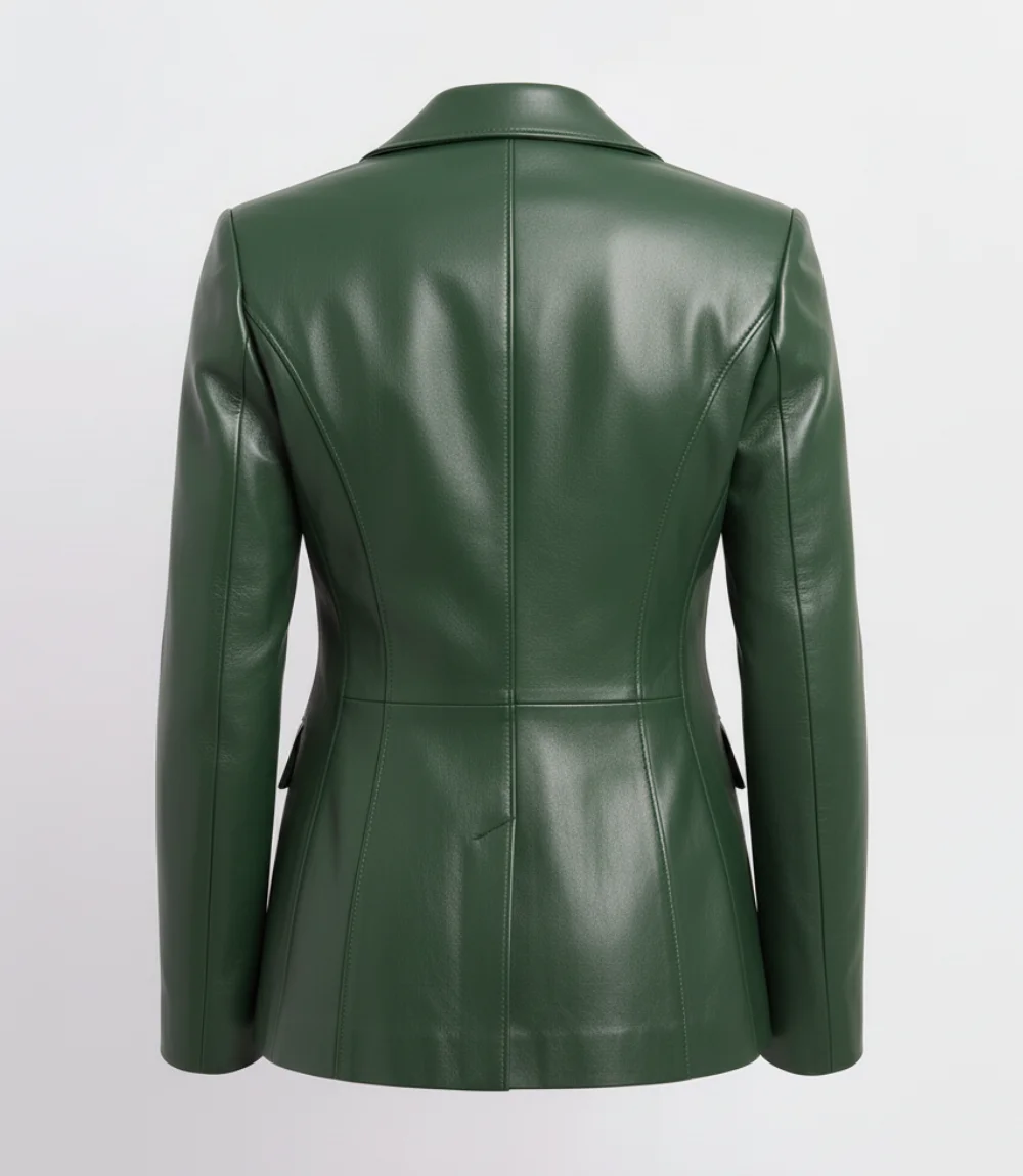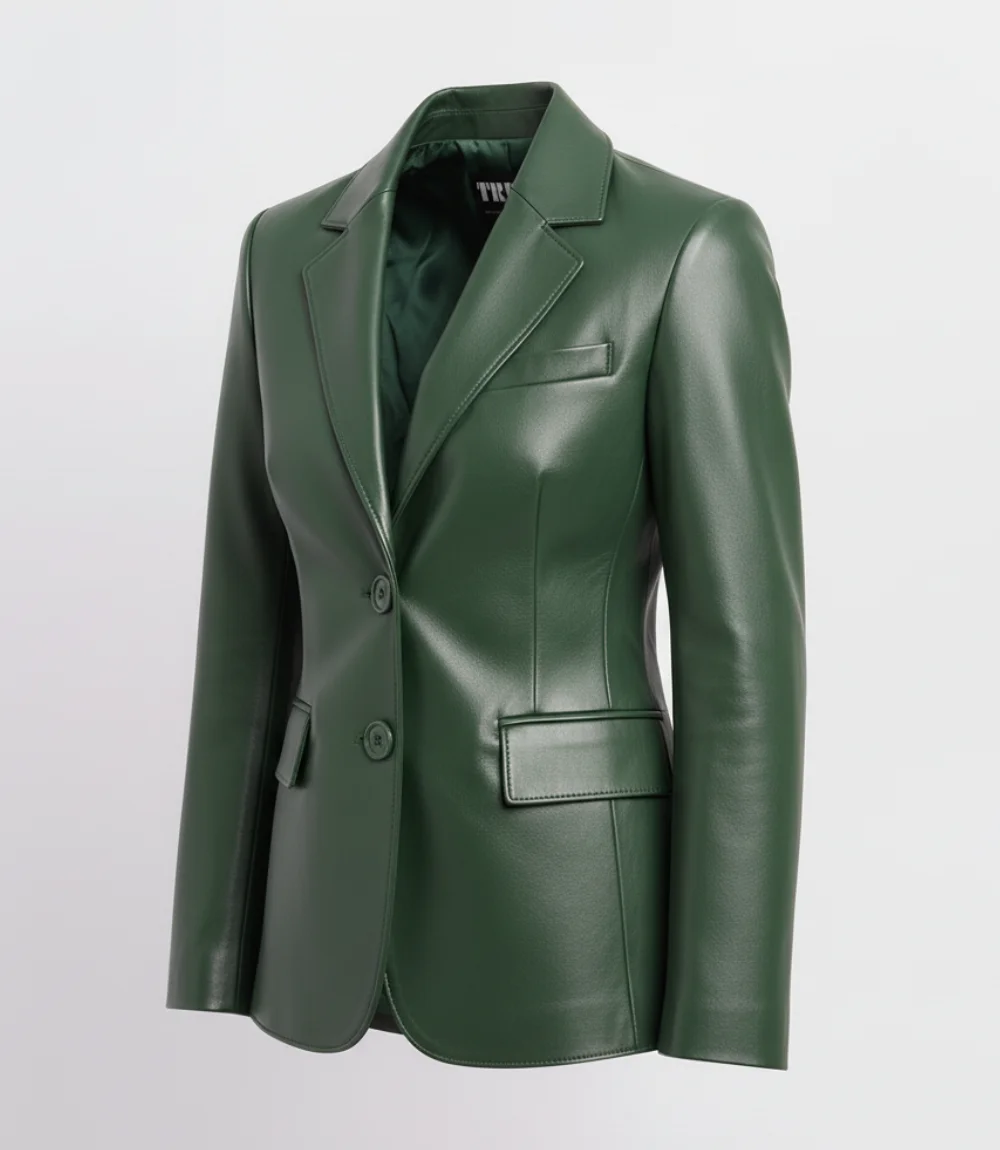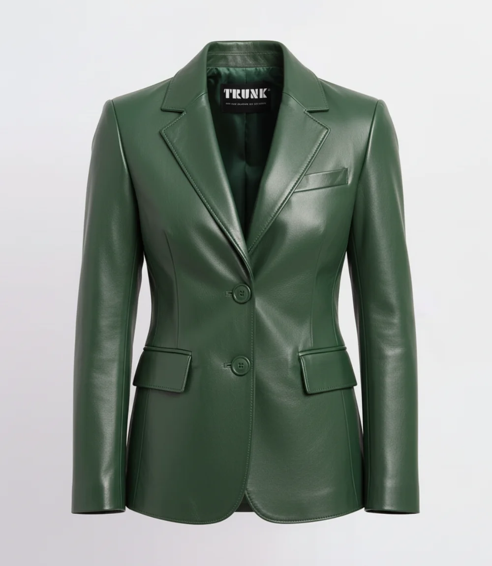 Elevate your wardrobe with the Women’s Two Button Green Lambskin Leather Blazer — a sophisticated piece designed for modern elegance. Made from 100% real lambskin leather, it features a soft and supple texture that ensures both comfort and durability. The classic lapel collar and two-button closure deliver a structured, tailored look perfect for both professional and casual settings.